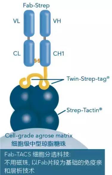 以Fab片段為基礎(chǔ)的無(wú)痕親和細(xì)胞分選技術(shù)(traceless affinity cell selection, Fab-TACS),由IBA Lifesciences根據(jù)其獨(dú)家的Strep-tag?/Strep-Tactin?蛋白純化系統(tǒng)發(fā)展而來(lái)。Fab-TACS運(yùn)用免疫親和層析的原理,利用細(xì)胞表面抗原分子CD marker與Fab片段的特異性結(jié)合來(lái)進(jìn)行捕捉及釋放目標(biāo)細(xì)胞。以不具磁性且可逆的試劑,取代一般具高親和力的完整抗體, 直接由全血或其他血液樣本來(lái)進(jìn)行溫和的標(biāo)準(zhǔn)化分選,因此能精準(zhǔn)的提供您不含標(biāo)記、未被活化的目標(biāo)細(xì)胞。