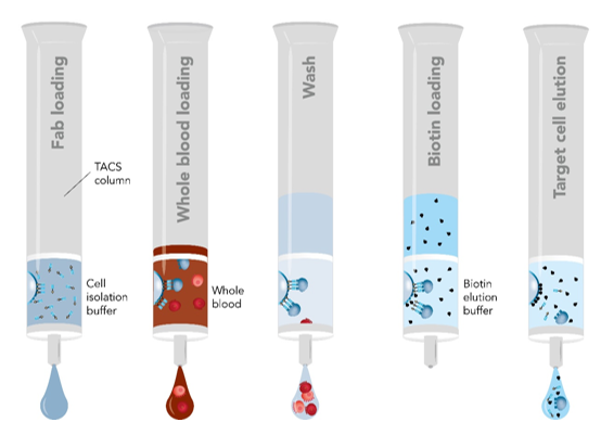 Fab-TACS柱子填充了包被有Strep-Tactin? 多聚體的細胞級瓊脂糖基質,偶聯上Strep-tag的Fab片段(Fab-Streps)特異性的結合到瓊脂糖基質上。隨后,加入全血或其他血液制劑流過柱子。目的細胞通過特異性的與Fab-Streps作用從而結合到瓊脂糖基質上,其他非目的細胞則有效的被洗去。最后,加入生物素使目的細胞從Fab-Streps上解離。至此,就已分離得到不帶任何標記的、真實的目的細胞可用于下游的實驗研究。