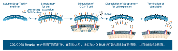 Streptamers?應用于T細胞擴增是目前T細胞擴增術中一項較新穎的技術。該技術的核心在于:將抗CD3和抗CD28的Fab-Streps結合到Strep-Tactin? 多聚體上,使它們形成可溶性的蛋白復合物。在刺激之后,通過加入D-Biotin來移除細胞上的刺激劑,從而適時終止刺激。