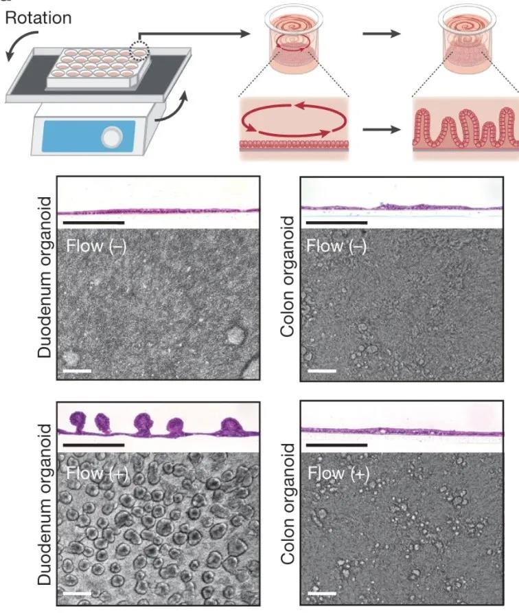 下圖為存在(+)或不存在(-)流動的培養(yǎng)基的情況下培養(yǎng)四天的2D十二指腸和結(jié)腸類器官的鏡下圖片。(蘇木精和曙紅染色)