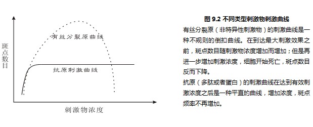其一、非特異性的刺激物刺激效果不穩(wěn)定。如圖9.2所示,非特異性的刺激物(有絲分裂原Mitogen)的刺激曲線幾乎沒(méi)有平坦的部分。也就是說(shuō),刺激物的濃度有細(xì)微變化,馬上就會(huì)體現(xiàn)在刺激斑點(diǎn)數(shù)目的變化上了,這樣實(shí)驗(yàn)結(jié)果很難完全重現(xiàn)。相反,抗原的刺激曲線非常平坦,只要達(dá)到有效刺激濃度,斑點(diǎn)頻率就不再變化。