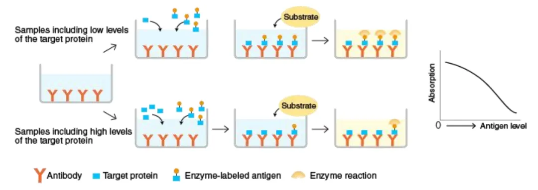 1、樣本中分析物水平較低可以使用哪些方法改進檢測?通過增加洗滌次數(shù)和兩次洗滌之間的浸泡時間降低背景。控制測定精確度。例如,在移液時要更加小心和一致,使用干凈的紙巾拍板,以避免污染。增加孵育時間。但這通常也會增加背景,因此檢測靈敏度不一定會增加。如果可以的話,建議濃縮樣本。使用5-PL曲線擬合方法,更準確地計算標準曲線下端的樣本濃度。在大多數(shù)情況下,樣本可能只含有非常低或無法檢測到的分析物水平。這時無論如何操作和測定,仍然無法檢測到準確濃度。2、包板應如何存放?如果包被完抗體的板不能立即使用,應將其密封并在4°C儲存過夜。3、為什么使用同一克隆號的捕獲抗體和檢測抗體建立ELISA實驗沒有成功?如果使用相同的克隆抗體進行檢測和捕獲,則抗原表位可能已經(jīng)被其中一種抗體占據(jù)并抑制另一抗體結(jié)合。建議捕獲和檢測抗體選擇不同的克隆號。4、應該使用哪種包被緩沖液?一般來說,建議使用PBS(pH 7.4)或碳酸鹽緩沖液(pH 9.5)。確切的包被緩沖液可能取決于要檢測的細胞因子。5、為什么細胞因子流式染色與ELISA測定之間沒有良好的相關(guān)性?流式細胞術(shù)檢測的胞內(nèi)細胞因子代表檢測時的陽性細胞比例,ELISA代表細胞因子隨時間的積累量??赡苌倭康年栃约毎谝欢螘r間之后會分泌大量的細胞因子于培養(yǎng)上清中,導致ELISA的結(jié)果與胞內(nèi)因子染色的結(jié)果不一致6、可以使用細胞培養(yǎng)板進行ELISA實驗嗎?不可以。細胞培養(yǎng)板設(shè)計用于達到細胞培養(yǎng)目的,通常不具有高蛋白結(jié)合能力。對于ELISA,建議使用具有高蛋白結(jié)合能力的板,例如 Nunc Maxisorp?酶標板。7、血清等樣本可以重復使用嗎?不建議重復使用樣本。為了獲得準確的結(jié)果,樣本應分裝儲存,僅供一次性使用。如果重復使用樣本,需要進行額外的驗證實驗,以確保實驗準確性。8、在什么步驟中,可以暫停ELISA實驗?可以冷凍板子以備后用嗎?最好遵循說明書操作,沒有任何可以暫停實驗的步驟。但是,如果一定需要暫停實驗,建議在封閉步驟(包被捕獲抗體后)??梢栽诳字屑尤?00 μL封閉緩沖液,并將板在4°C過夜(信號損失最小或沒有)或在-20°C冷凍幾天(可能會對信號產(chǎn)生一些影響)。不建議在第一步進行(在4°C用捕獲抗體包被超過16-20小時),因為可能會導致高背景。9、包被捕獲抗體可以超過過夜的時間嗎?通常來說,建議在4°C包被16-20小時。較長的孵育時間可能會增加與板結(jié)合的捕獲抗體量,會增加背景。10、培養(yǎng)基中的酚紅會干擾ELISA測定嗎?不會,培養(yǎng)基中酚紅的吸光度可以在計算時,通過扣除空白孔中本底的吸光度而消去,因此不會干擾ELISA測定的讀數(shù)。11、對于一些ELISA試劑盒,為什么血清樣本需要稀釋?血清樣本稀釋可以盡量減少樣本和標準品之間的基質(zhì)差異,以獲得更加準確的結(jié)果。12、如何提高ELISA檢測獲得更好的信號和靈敏度?增加孵育時間,但這也可能會增加檢測的背景,同時不改變靈敏度。在孵育步驟中搖動板子。確保標準品在使用前完全溶解。在兩次洗滌之間增加浸泡時間,以進一步降低背景。如果可以的話,在450-570 nm處讀板以減去本底。通過控制移液誤差或使用更大體積的洗滌緩沖液洗滌來改善CV值。使用5-PL或4-PL曲線擬合方法,而不是線性曲線擬合。