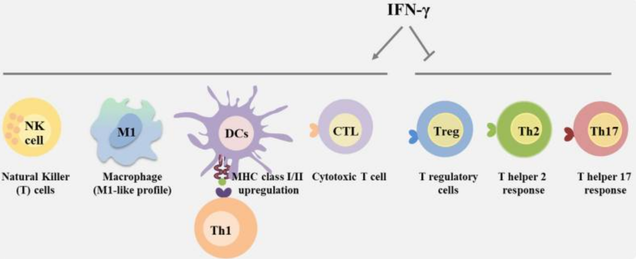 IFN-γ信號通路協(xié)調(diào)多種生物反應,在先天和適應性免疫中扮演的重要角色。IFN-γ可以通過促進Th1細胞、CD8+T淋巴細胞、NK細胞、樹突狀細胞及巨噬細胞的活性,抑制Treg、Th2和Th17細胞分化和功能,發(fā)揮免疫調(diào)節(jié)作用。此外,IFN-γ可激活巨噬細胞,使其分化為M1型巨噬細胞。