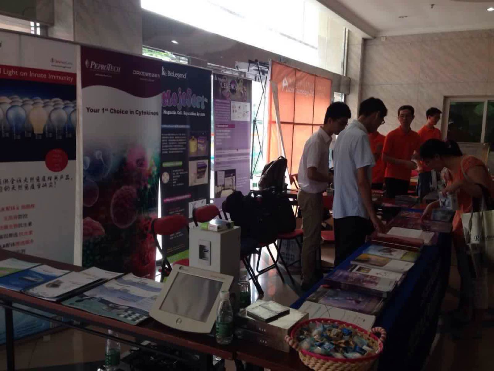 我司在A1號(hào)展臺(tái),準(zhǔn)備了5副免疫殺撲克牌供展覽用,同時(shí)帶來公司的產(chǎn)品目錄冊(cè)以及免疫組(小彩圖:mechanisms of cell death,DC、巨噬細(xì)胞,中彩圖:Breg,Treg,th17)等資料以及細(xì)胞組的轉(zhuǎn)染、細(xì)胞治療組的PPT和儀器彩頁等資料供參會(huì)人員瀏覽,展臺(tái)的兩邊我們放置了多因子、磁珠分選等3個(gè)易拉寶供參會(huì)人員觀看,技術(shù)部同事現(xiàn)場(chǎng)進(jìn)行技術(shù)儀機(jī)器演示。