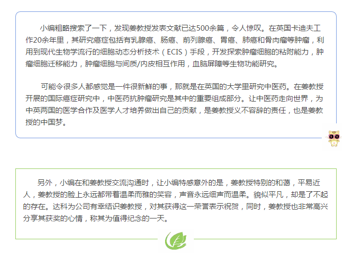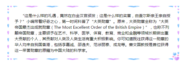 2017年3月16日,英國(guó)卡迪夫大學(xué)的華人科學(xué)家姜文國(guó)教授在倫敦白金漢宮接受了英國(guó)王儲(chǔ)查爾斯親王親自授予的2017年度“大英勛章”,表彰其在“國(guó)際癌癥研究方面的突出貢獻(xiàn)”, 成為首位獲得這一榮譽(yù)勛章的原籍為中國(guó)大陸的科學(xué)家。