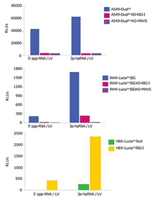 ISG對RIG-I配體的反應:使用300 ng/ml的5’ppp-dsRNA或30 ng/ml的3p-hpRNA刺激衍生自A549的細胞;使用1 μg/ml 5’ppp-dsRNA或3p-hpRNA刺激衍生自RAW和HEK293的細胞。經過孵育過夜,可使用QUANTI-Luc?檢測上清中Lucia熒光素酶活性的相對光單位(RLUs)以測試ISG的反應。