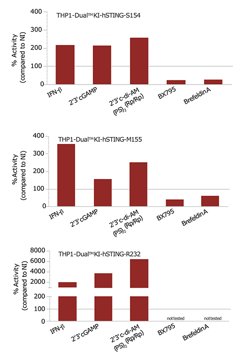 對IFN-β或STING激動劑的ISG應答:使用104 U/ml IFN-β, 10 μg/ml 2’3’ cGAMP或2’3’ cGAMP(PS)2(Rp/Sp), 30 μM BX795 or 10 μg/ml Brefeldin A刺激衍生自THP1-Dual?細胞。孵育過夜后,通過使用QUANTI-Luc?檢測上清中Lucia熒光素酶活性測試ISG應答。Bar值表示非刺激細胞中背景信號標準化的活性百分比。
