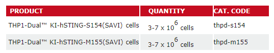 InvivoGen提供給一系列基于人源THP1單核細胞系的STING突變體的報告基因細胞株。其中,有兩款表達STING- associated vasculopathy with onset in infancy(SAVI)的功能獲得性突變體(S154 and M155)。SAVI患者在STING蛋白中顯示出單一突變,導致其持續(xù)激活和ISG的過度活化。S154是新生突變[1],M155是遺傳突變[2]。STING SAVI報告基因細胞株是篩選STING通路抑制劑便捷有力的工具。