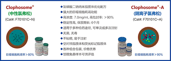 體內(nèi)巨噬細胞耗竭(in vivo macrophage depletion)是巨噬細胞功能研究的重要方法之一。FormuMax公司推出的Clophosome?系列產(chǎn)品就是將膜不通透性的氯磷酸鹽—氯磷酸二鈉(clodronate)包裹于脂質(zhì)體內(nèi)并帶入細胞,利用巨噬細胞的內(nèi)吞機制實現(xiàn)巨噬細胞的耗竭。