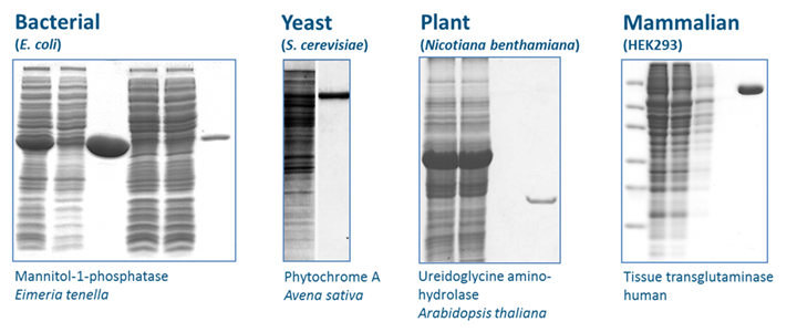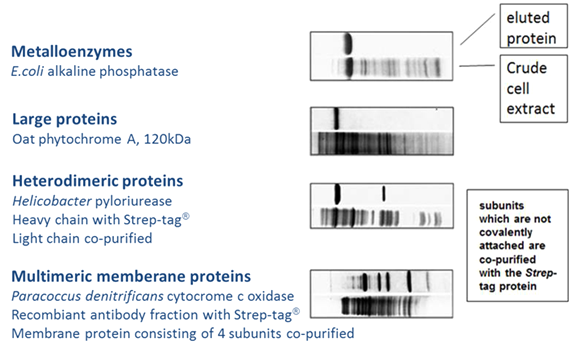 因His-tag系統(tǒng)使用Ni離子,所以在純化金屬蛋白(多數(shù)為酶)時,可能會受到金屬間交互作用的干擾。而使用Strep-tag? 則不會出現(xiàn)此問題,因為Strep-Tactin? XT與Strep-tag?的特異性結(jié)合不受金屬離子影響。且因其溫和的純化流程,所以還能用于純化大型蛋白、多亞基的蛋白復合體或是跨膜蛋白,并且保持蛋白功能。以Strep-tag?系統(tǒng)純化出不同的蛋白實例如下: