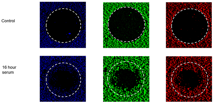 細胞排斥區(qū)分析(間隙封閉法)是Platypus公司獲得專利的技術。讓細胞在孔的底部圍繞一個阻止細胞生長的區(qū)域(如在孔底部中央放置阻塞物)生長,實驗在移除阻塞物后開始,可觀察單層細胞遷移到原先的空白區(qū)域中。