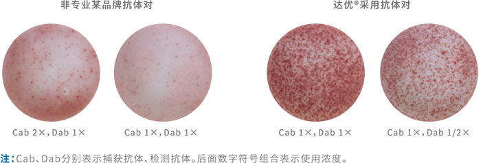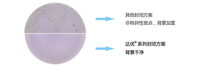 不同的檢測樣本在板孔培養(yǎng)過程中,受各種實(shí)驗(yàn)條件影響,如果封閉不當(dāng)都可能產(chǎn)生非特異性顯色,導(dǎo)致非特異性斑點(diǎn)的產(chǎn)生或者背景顏色的加重。這將直接影響到最后結(jié)果的判斷分析。達(dá)優(yōu)?系列產(chǎn)品通過大量實(shí)驗(yàn),對(duì)不同來源、不同配方封閉方法進(jìn)行封閉效果的對(duì)比試驗(yàn),篩選出更高效的封閉系統(tǒng),并將之運(yùn)用到系列試劑盒產(chǎn)品中。