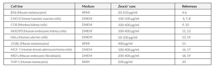 Zeocin?通常以100 μg/ml的濃度使用,即將原液(100 mg/ml in HEPES buffer)稀釋1000倍使用。但也需要根據您的具體細胞來確定最佳濃度。下表列出了在一些哺乳動物細胞篩選實例中的Zeocin?建議濃度。