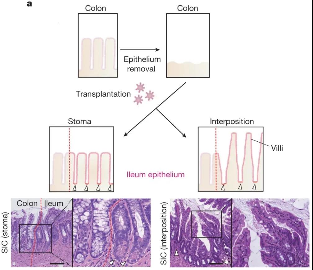 通過上皮置換產(chǎn)生SIC的策略。頂部,結(jié)腸上皮被去除(EDTA處理),然后回腸類器官被移植。在進(jìn)行介入手術(shù)之前,移植的回腸上皮顯示出隱窩狀結(jié)構(gòu)(左下圖和圖像)。移植后,會形成絨毛狀結(jié)構(gòu)(右下圖和圖像)。白色箭頭表示潘氏細(xì)胞。