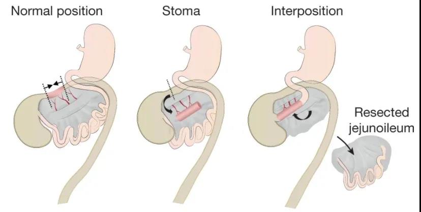 分兩步進(jìn)行的手術(shù)方法,用于在空腸的起點(diǎn)和回腸的終點(diǎn)之間插入需要移植的結(jié)腸類器官。