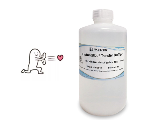 當(dāng)然蛋白電泳只是WB實(shí)驗(yàn)的第一步,那還有什么方法能加快后續(xù)實(shí)驗(yàn)(如轉(zhuǎn)膜)進(jìn)程呢?別急,今天就給大家介紹一款來自分子產(chǎn)品專家Expedeon公司的快速轉(zhuǎn)膜液——InstantBlot?Transfer Buffer(貨號(hào):NXB87500),作為Expedeon的一款專利產(chǎn)品,該轉(zhuǎn)膜液能夠大幅提升蛋白從“膠”至“膜”的轉(zhuǎn)移速度,最快只需10 min即可完成轉(zhuǎn)膜,并且不會(huì)產(chǎn)生過多的熱量,避免影響蛋白的后續(xù)檢測。