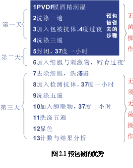 如圖2.1所示,預包被有著明顯的技術優(yōu)勢。PVDF板的ELISPOT試驗一共需要3天時間,采用預包被板可以節(jié)省一天的時間,當天處理細胞,當天上板檢測;未包被的檢測共有13步,預包被可以省掉其中的5步,并且這5部都是需要無菌操作的步驟,占整個無菌操作步驟的5/6。節(jié)省時間只是其一,由于減少了無菌操作的步驟,使得整個實驗污染與出錯的概率大大降低,提高了整體試驗的成功率。