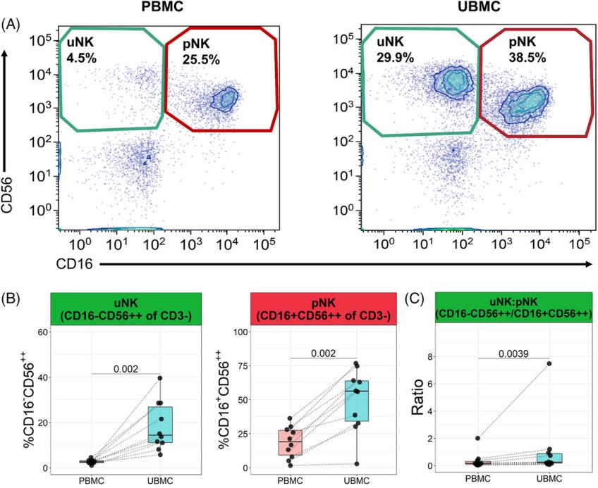 Kahn等人采用了一種從胎盤床收集白細胞的技術(shù),即在剖腹產(chǎn)后使用手術(shù)海綿擦拭子宮腔。這種方法通常用于確保胎盤從子宮腔中完全移除并清除多余血液,因此不會給患者帶來額外的風險。本文采用這種方法分析胎盤床NK細胞、T細胞、B細胞和單核細胞的表型,并與外周血樣本中對應(yīng)細胞進行比較。