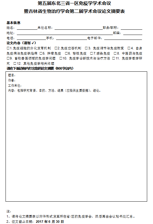 2. 請(qǐng)使用《第五屆東北三省一區(qū)免疫學(xué)學(xué)術(shù)會(huì)議論文摘要表》撰寫(xiě)來(lái)稿。